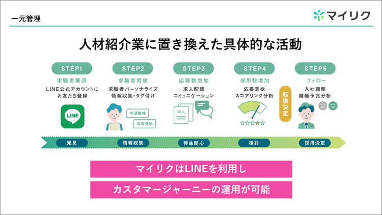 マイリクの基本機能や導入メリットをわかりやすく解説します。具体的な活用事例を交え、採用フローの各段階でマイリクがどのように役立つのかをご紹介しています。LINEを活用した求職者とのエンゲージメント向上策や、入社後のフォローアップによる定着率改善についても詳しく説明しています。
